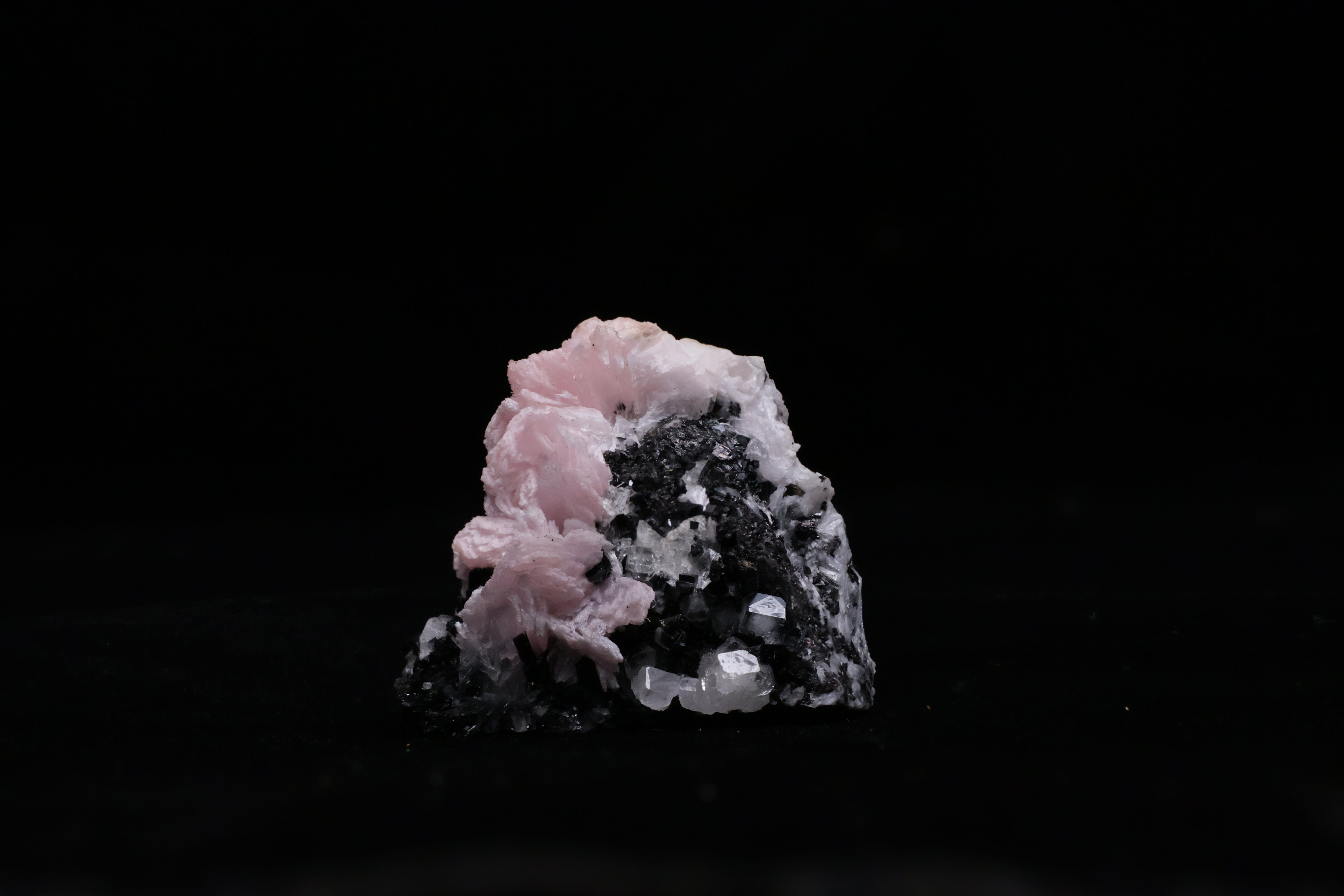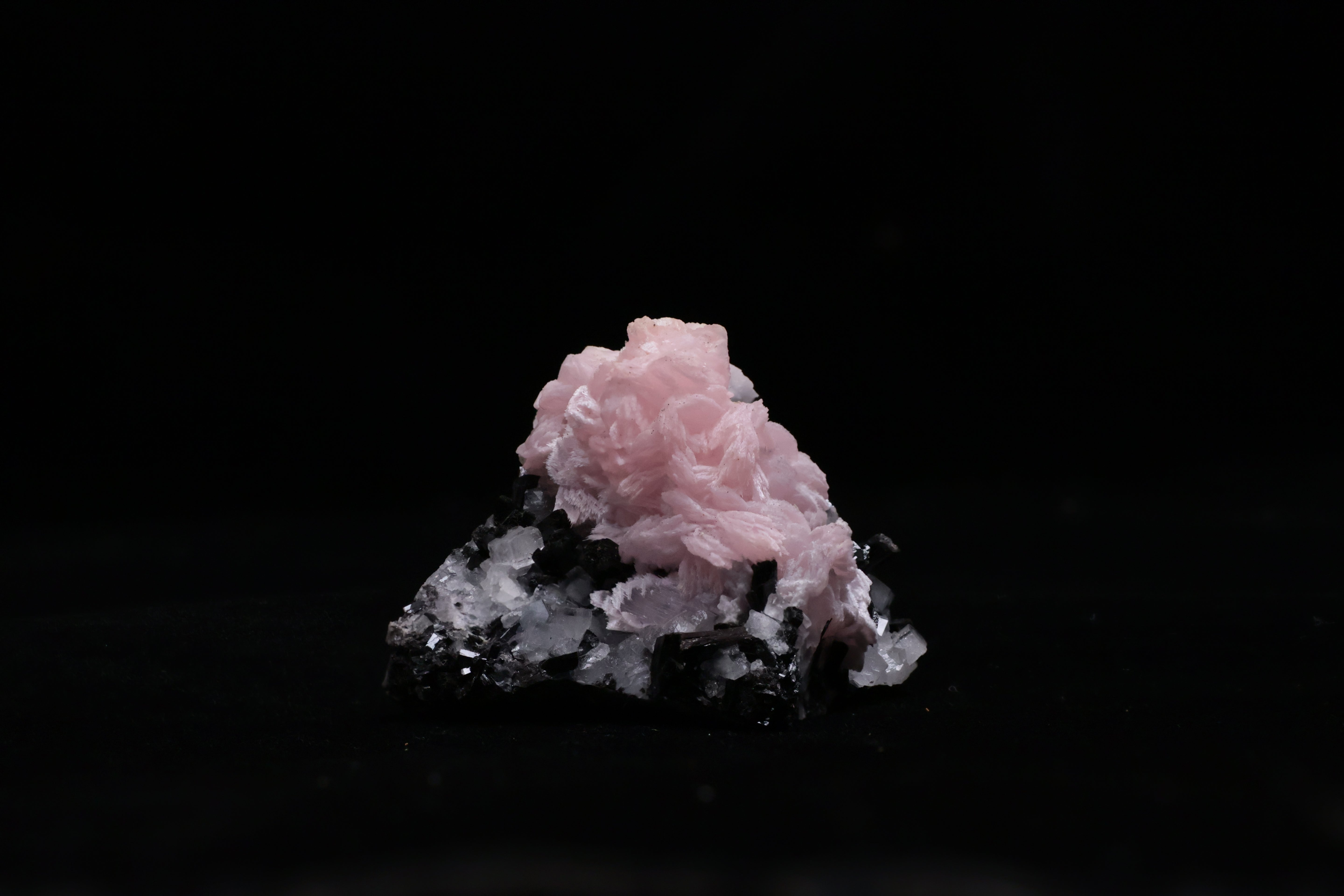 Rare Pink rose calcite (Orange UV Light) with clear quartz on black tourmaline