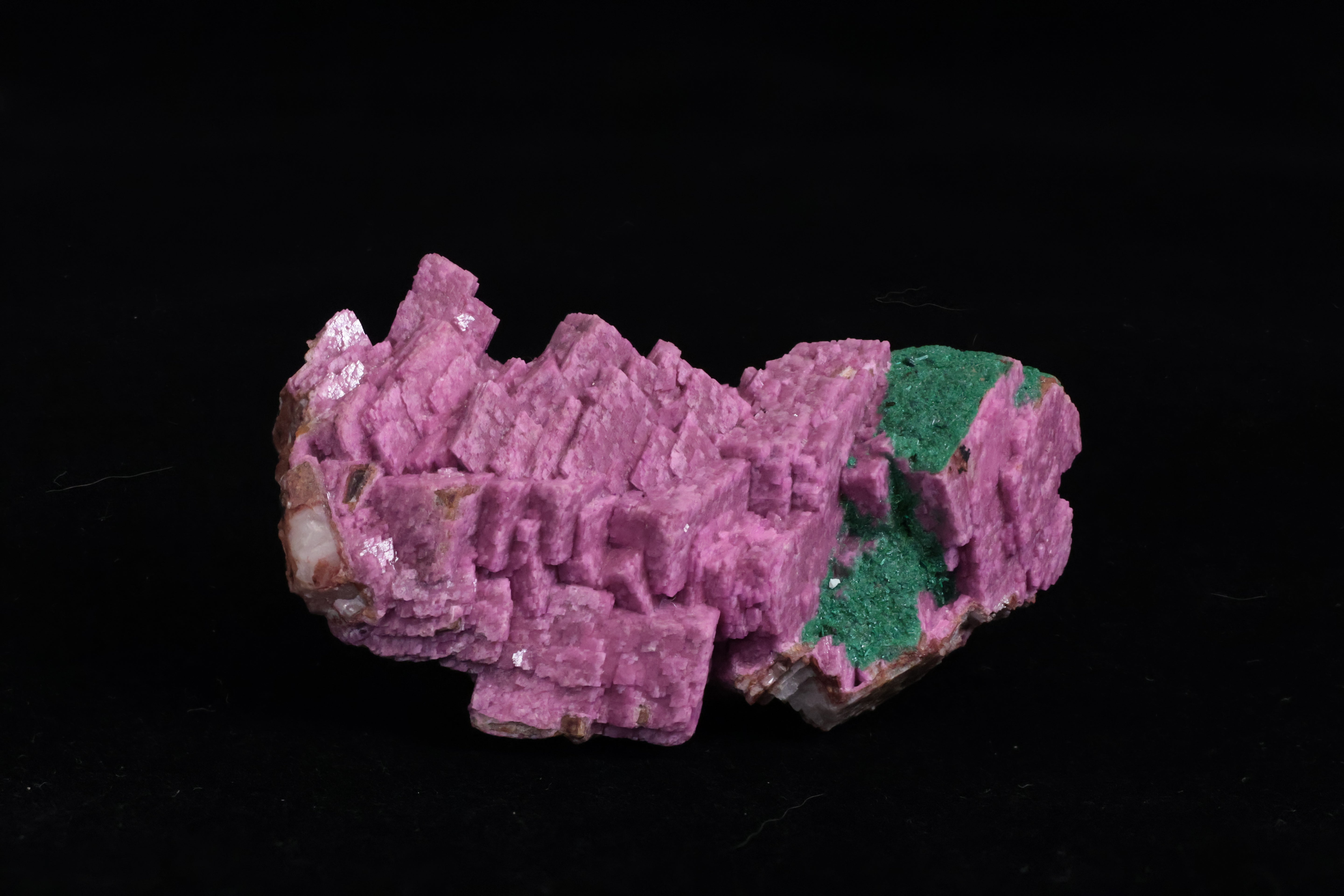 Cobaltoan dolomite is typically pale pink, rose-colored, or even reddish, due to the presence of cobalt. The cobalt ions in the crystal lattice impart the characteristic pink to purple hue to the dolomite. Malachite is a secondary copper mineral, meaning it forms as a result of the oxidation of copper deposits. And it's known for its vivid green color. The combination of soft pink with bright green often creates aesthetic harmony, as the cobaltoan dolomite adds a delicate, pastel-like contrast to the deep green malachite.These minerals form in relatively specific geological environments, making specimens featuring both minerals quite rare.