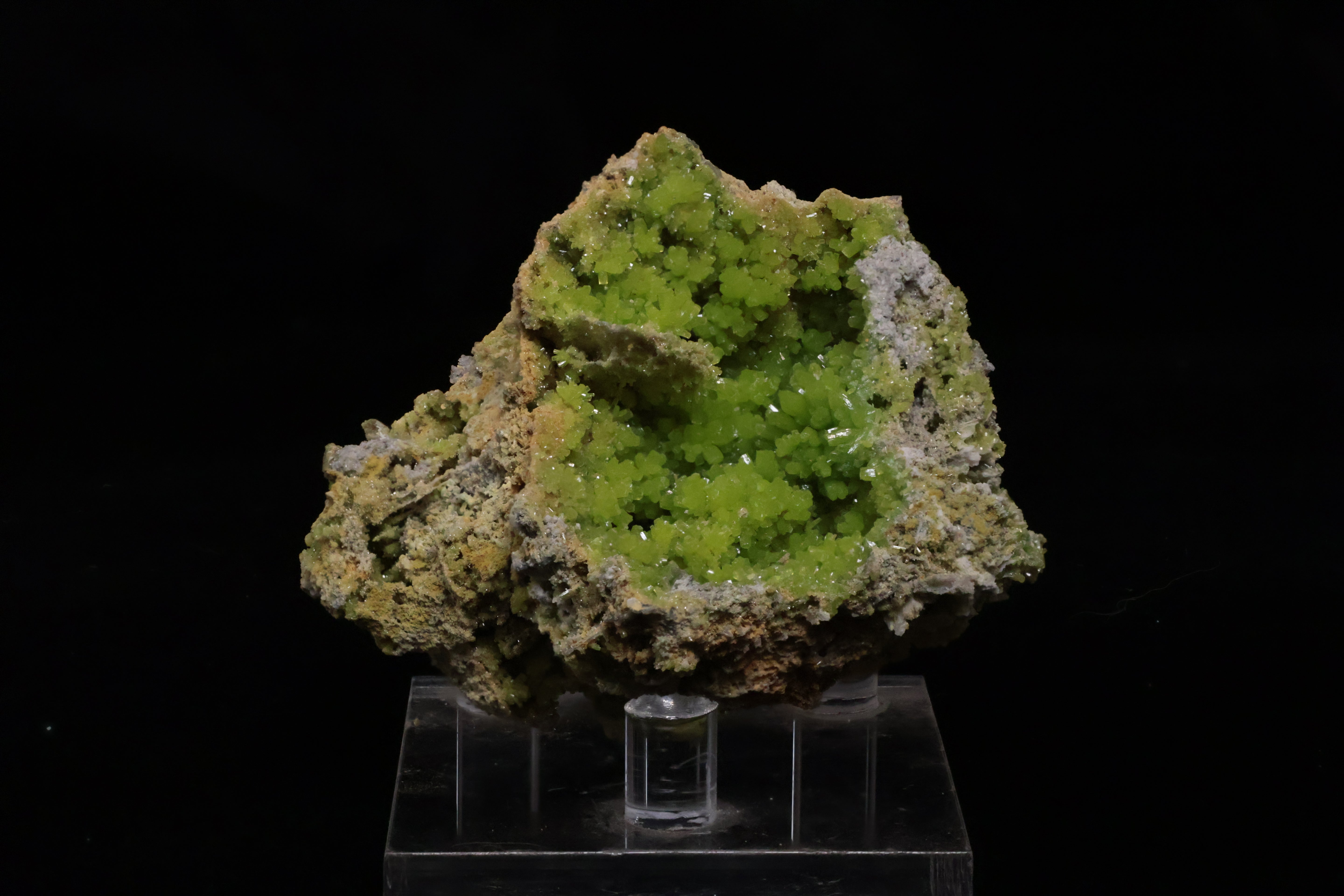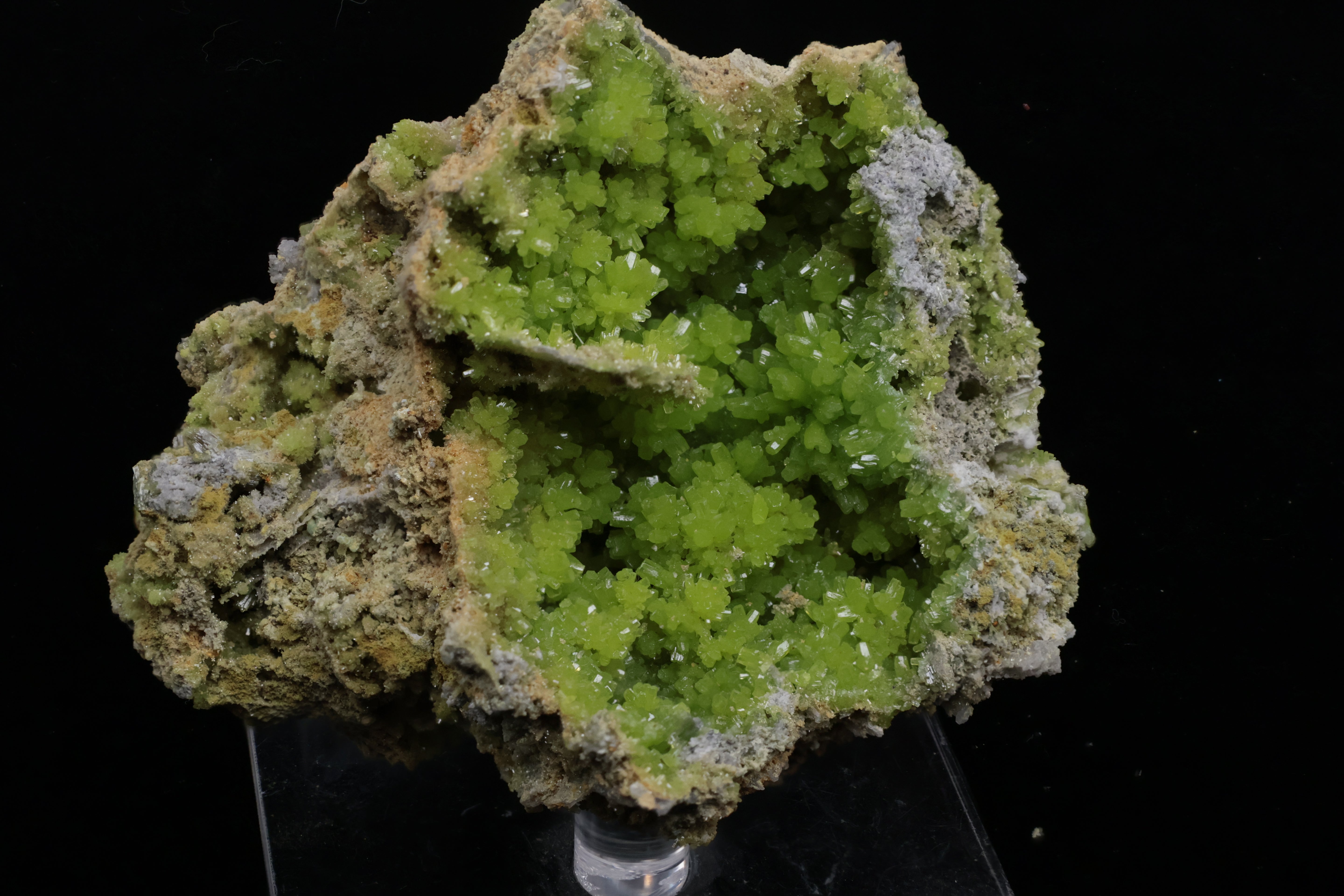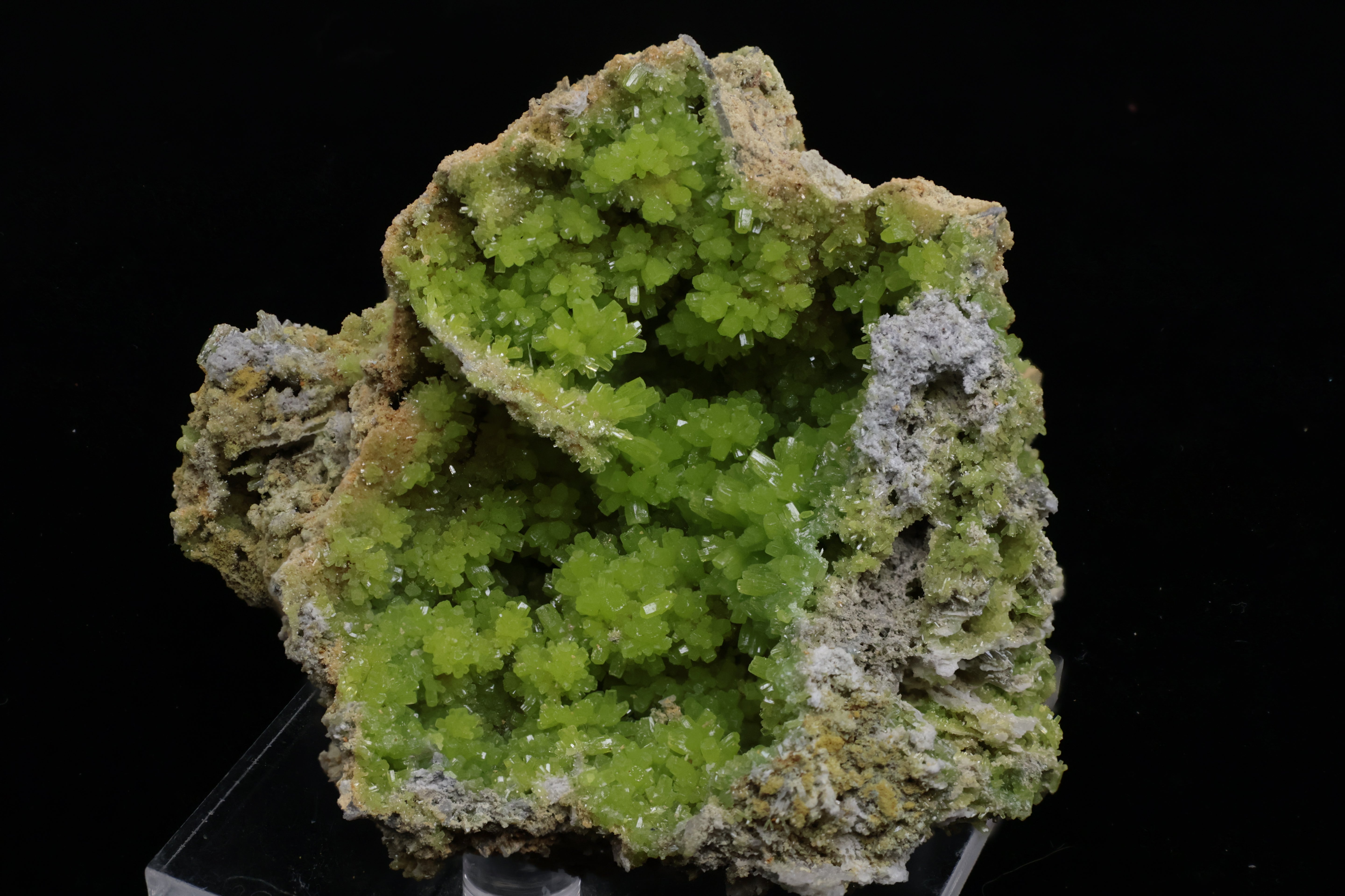 That vivid lime-green specimen appears to be pyromorphite, a lead-based mineral known for its surreal, mossy growth and vibrant fluorescence under light.  It often forms in miniature, botryoidal clusters or spiky hexagonal crystals—like alien coral growing on a mountainside.This distinctive emerald-green hue originates exclusively from Chinese mineral deposits, displaying a chromatic signature unmatched by counterparts from global localities of the same species.The more complete the crystal, the greater the collection value.