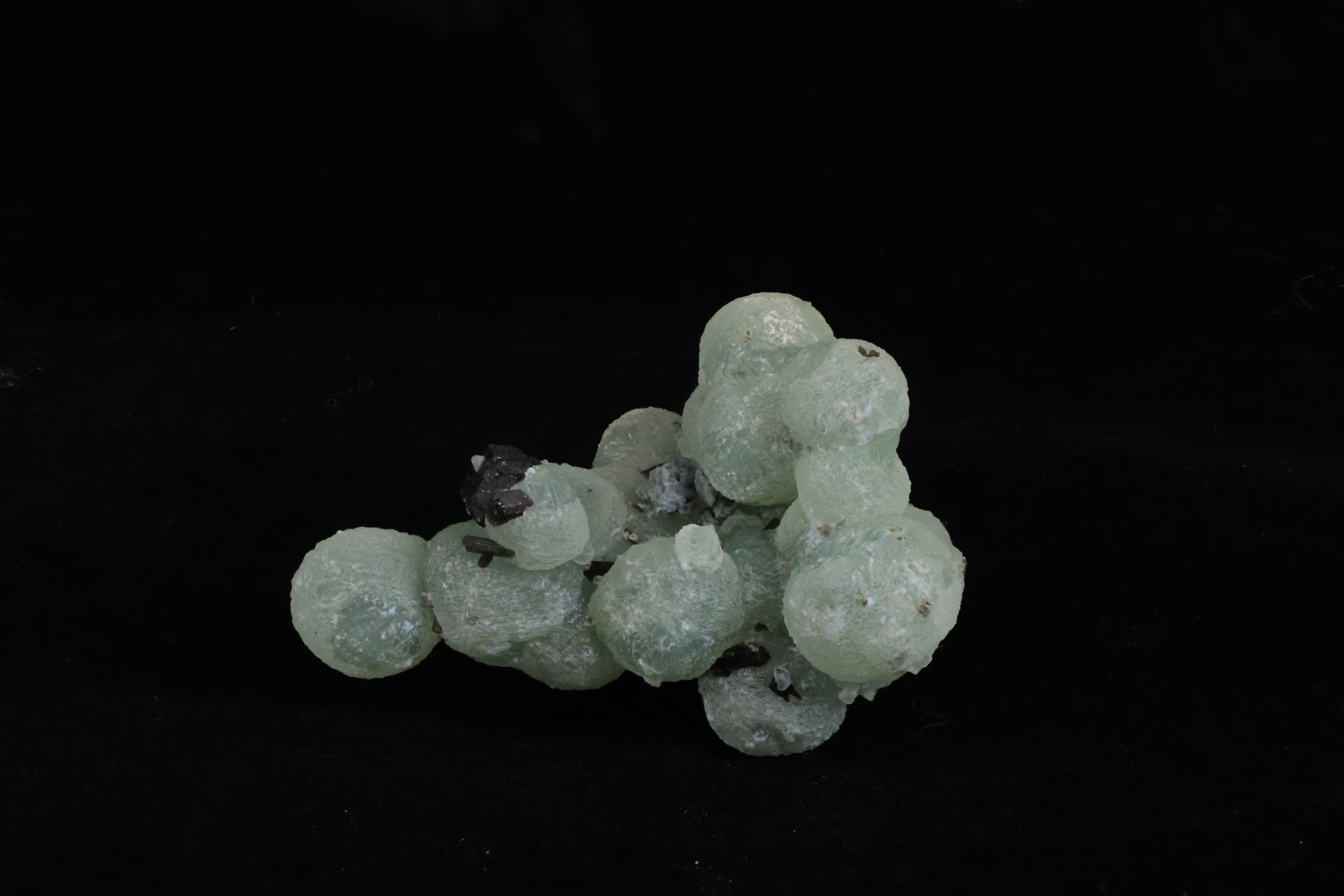 Prehnite (chemical formula: Ca₂Al(AlSi₃O₁₀)(OH)₂) is a phyllosilicate mineral known for its soft apple-green to olive hues. Its tabular crystals or botryoidal clusters with waxy luster and translucent allure have earned it the reputation as the "gentle scholar" of mineral collections.
