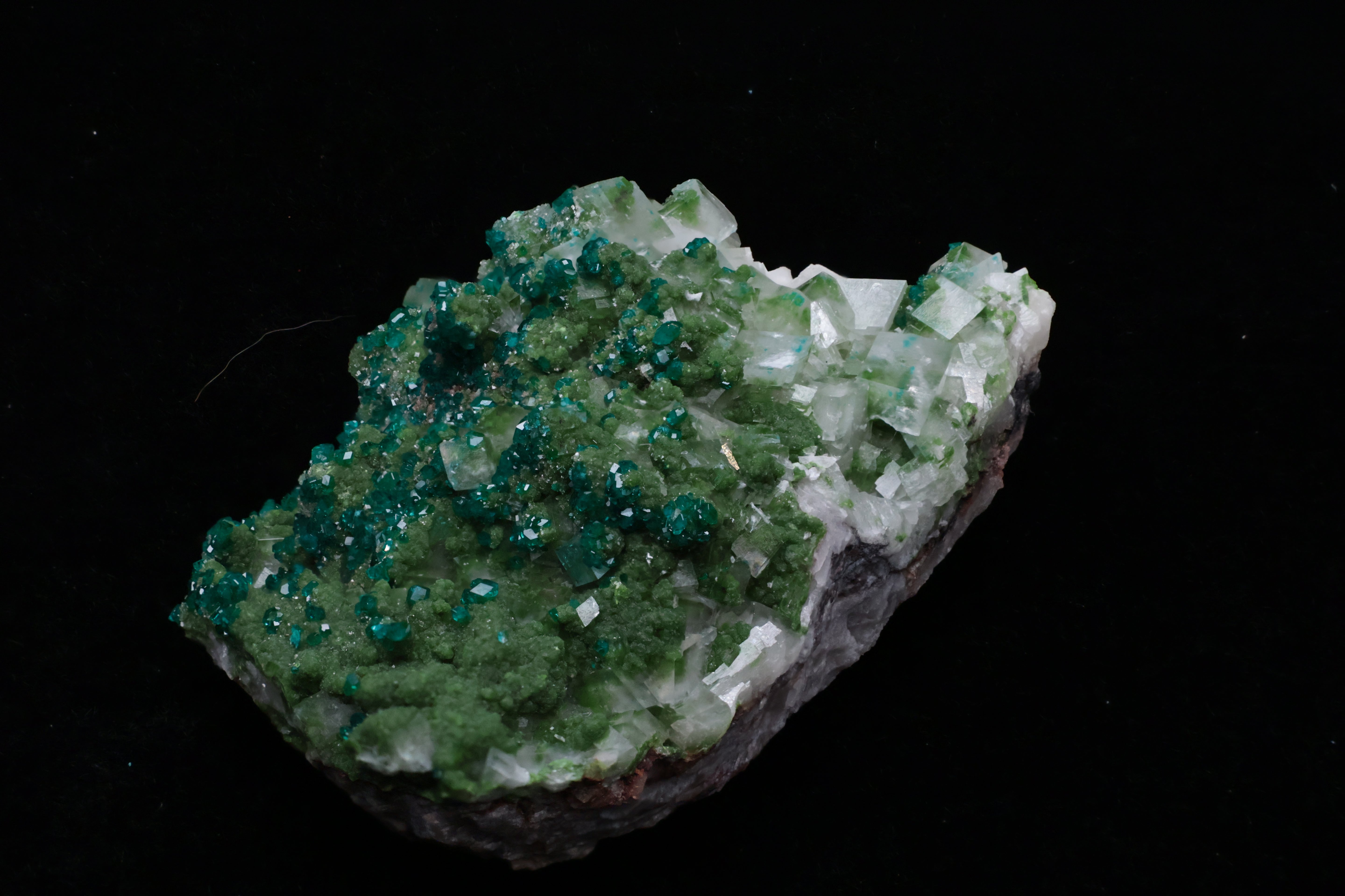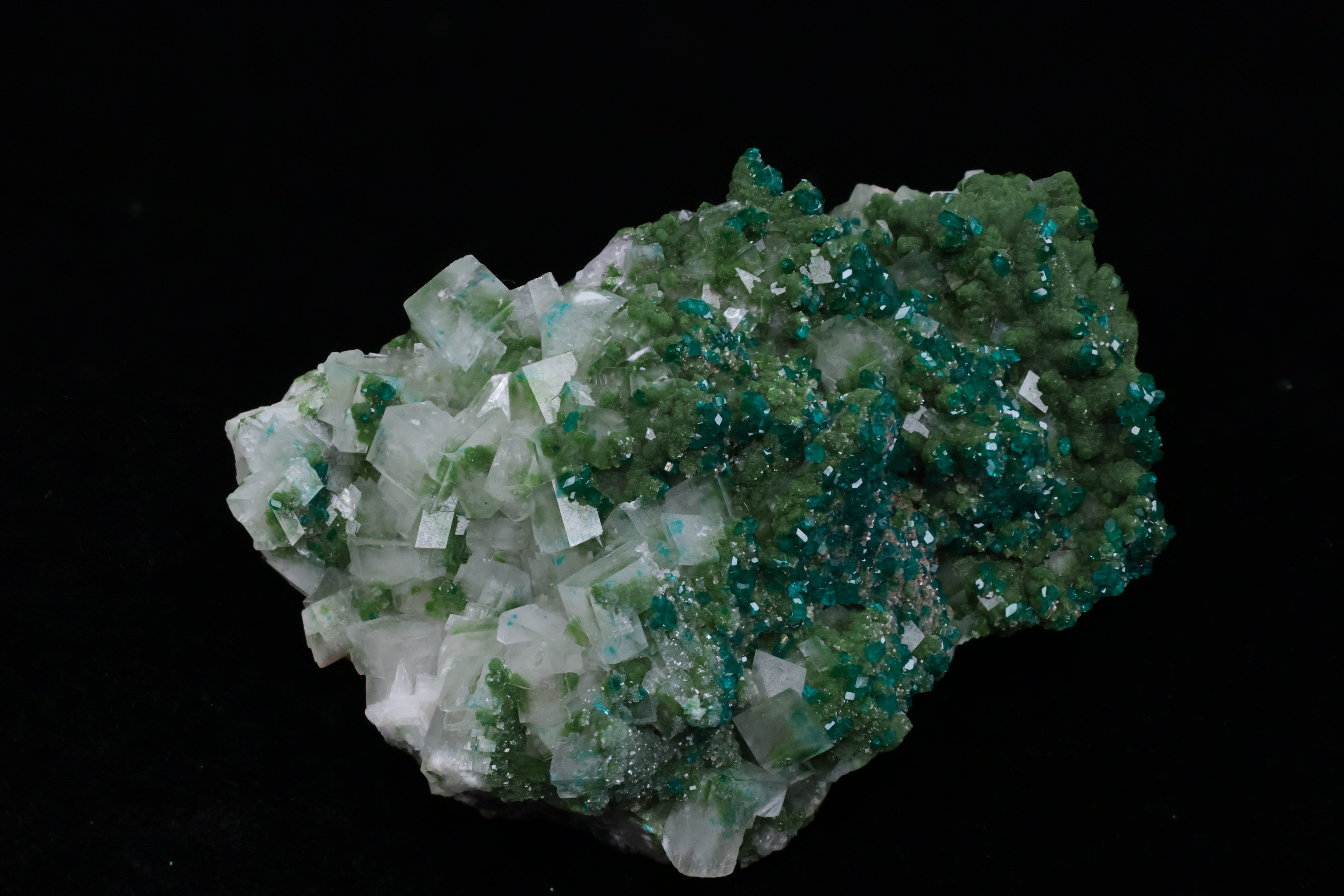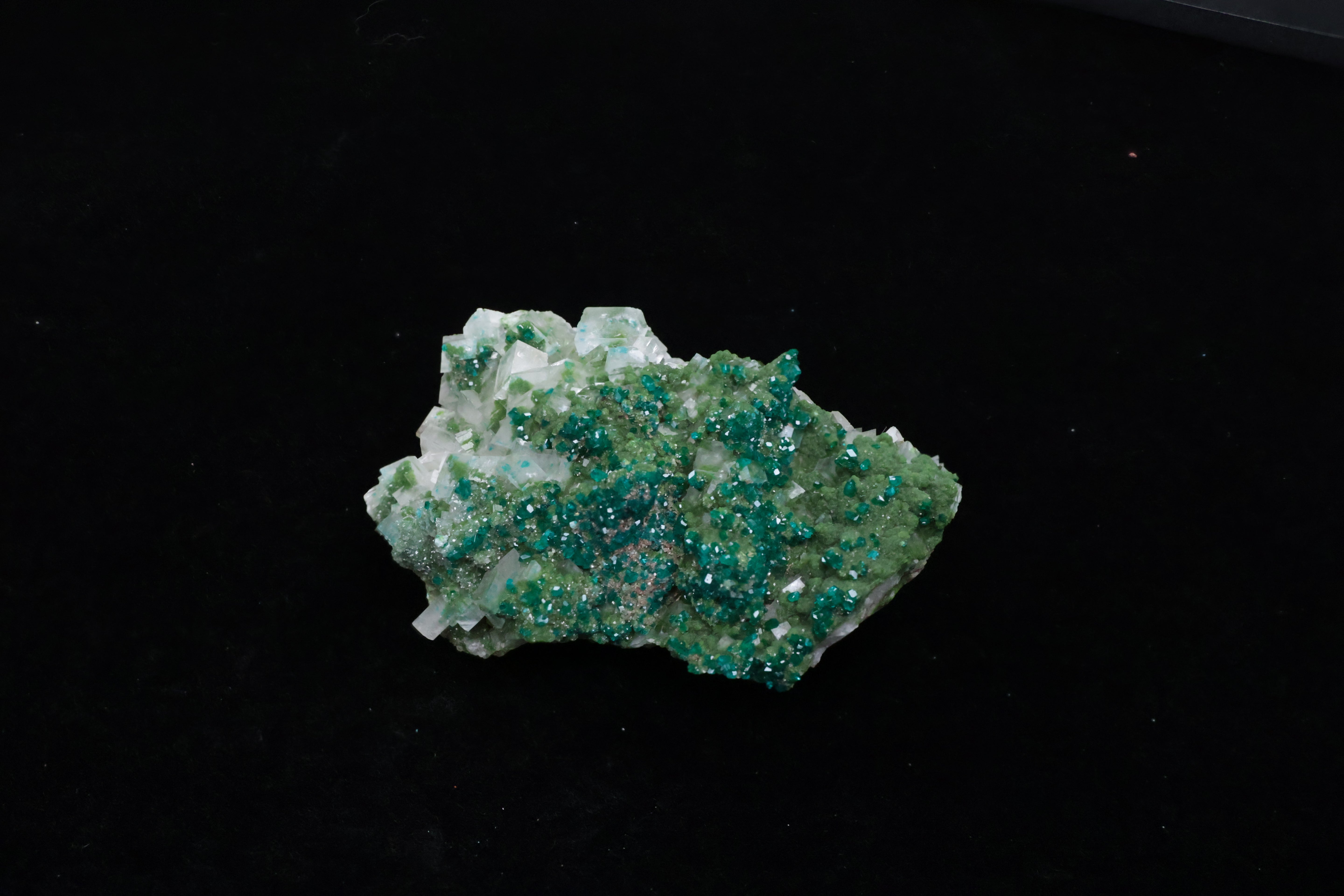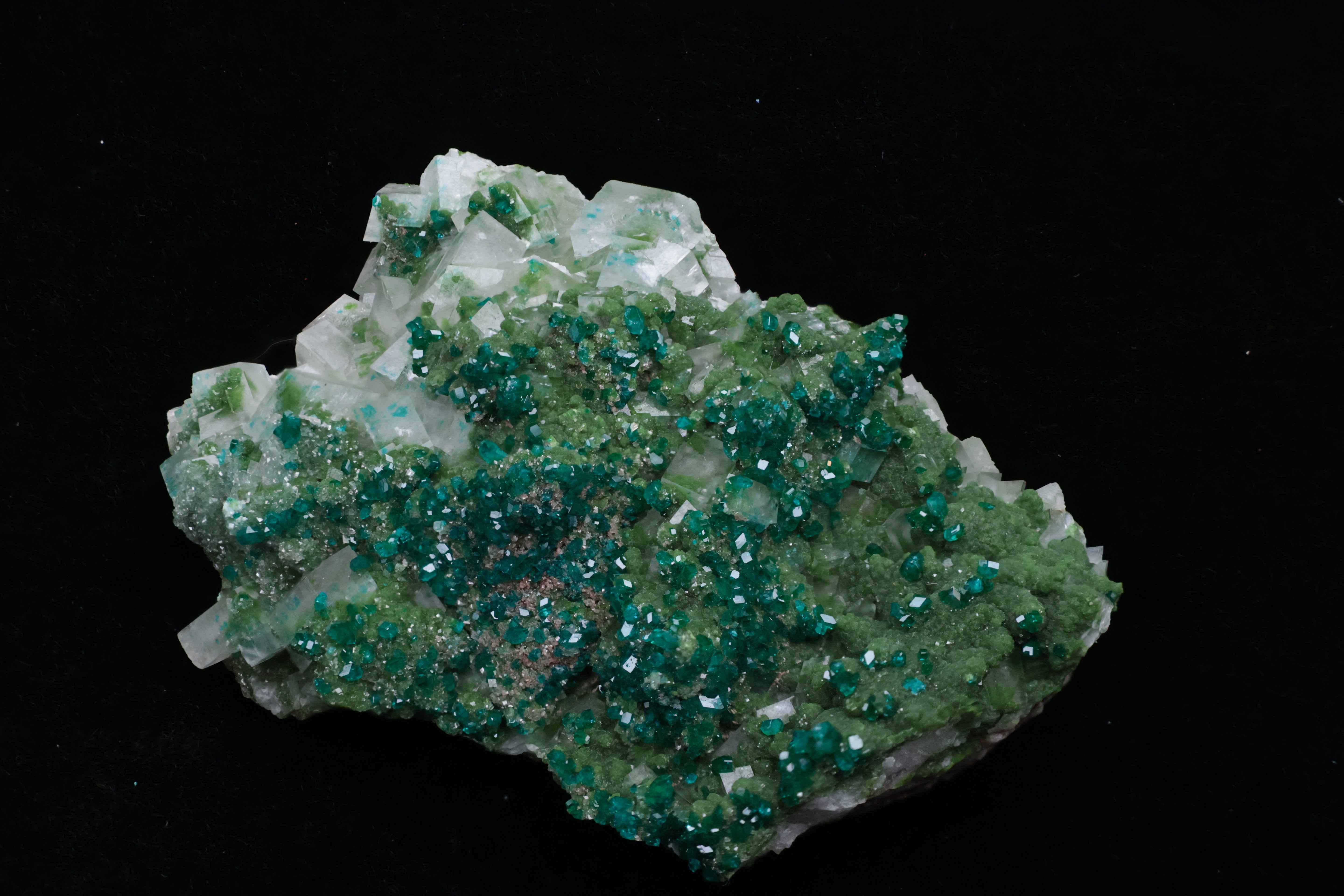 Dioptase and mottramite are both copper-bearing minerals, and they typically form in copper-rich environments, especially in areas with significant hydrothermal activity.   The presence of arsenic in mottramite and cobalt in dioptase helps to explain their association in certain geological settings.The presence of calcite in these specimens is often the result of secondary mineralization in the same hydrothermal system, where calcite precipitates out of the mineral-rich waters to form a matrix for other minerals to grow on.