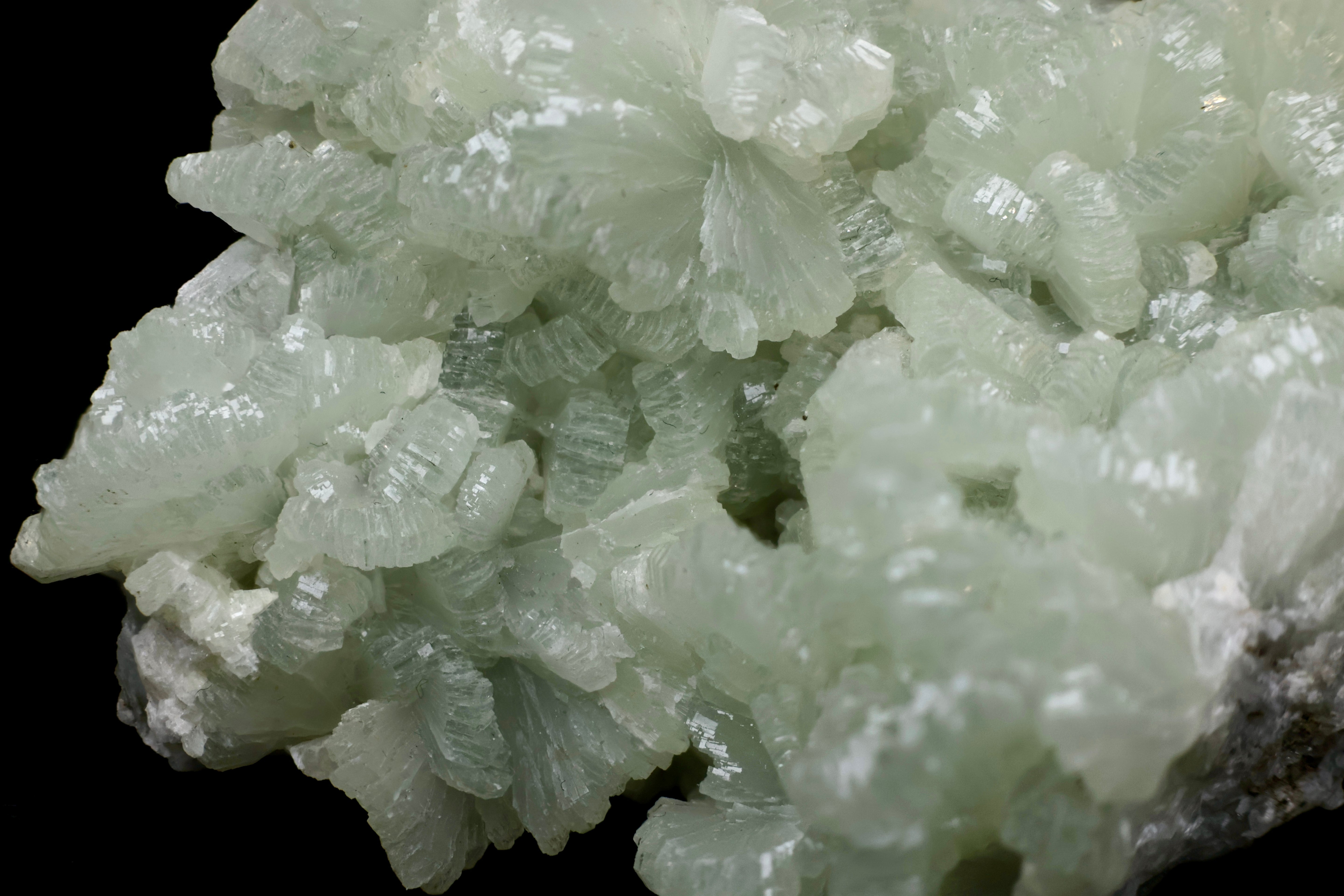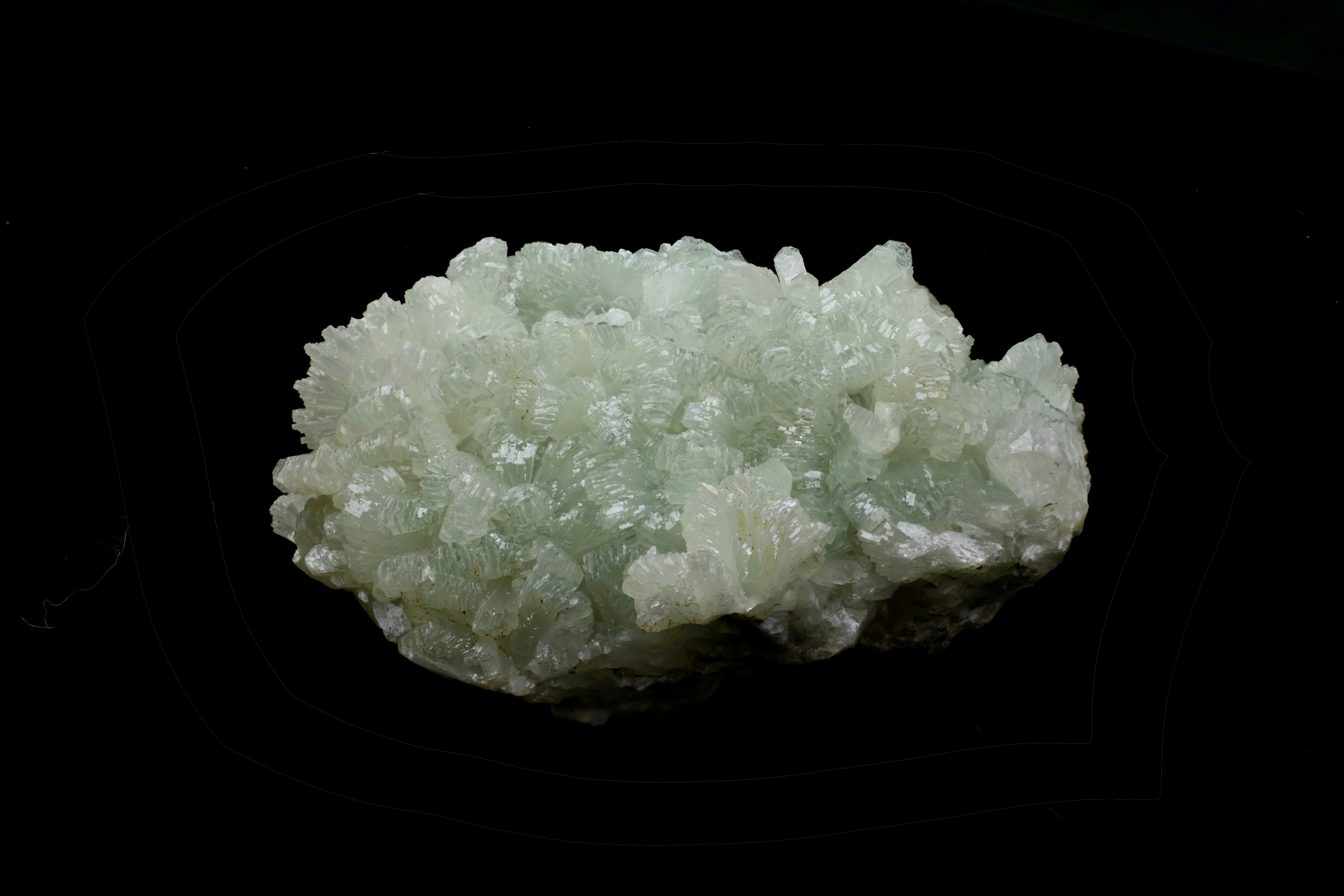 Prehnite (chemical formula: Ca₂Al(AlSi₃O₁₀)(OH)₂) is a phyllosilicate mineral. It forms tabular, botryoidal, or radiating aggregates in soft apple-green to olive hues. Its translucent texture and greasy luster evoke a serene elegance, earning it the title of "the healer’s stone" in mineral circles.